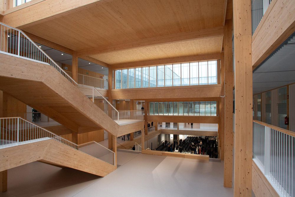 Según la información técnica del proyecto, el edificio incorpora más de 2.900 metros cúbicos de productos de madera, fruto de la suma de más de 2.200 metros cúbicos de elementos industrializados, fabricados por Stora Enso, grupo forestal sueco-finlandés de materiales renovables, especializado en construcción en madera, entre otros sectores; y otros 700 metros cúbicos de productos técnicos de madera, ensamblados en el centro de producción de Oricáin de la empresa navarra Madergia, asociada a la red de la citada firma nórdica en la Península Ibérica.