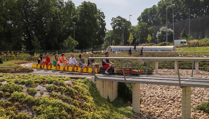 Un total de 6.740 m2 de recinto en los que se ha dispuesto un circuito ambientado con elementos decorativos (vallas de madera, señales, marmitas, desvíos y semáforos) y un edificio de cocheras para guardar las locomotoras. La instalación también alberga un edificio principal que simula la estación dispuest o en un inmueble de 196,8 m2 organizado en dos volúmenes conectados por una cubierta de 401,60 m2.